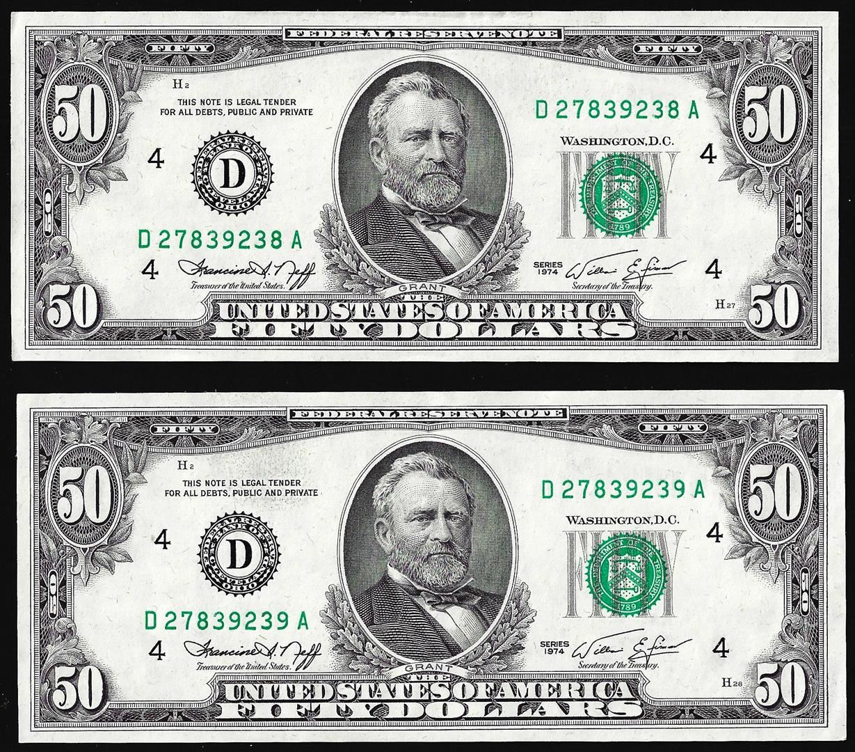 One Lot of (2) Consecutive 1974 $50 Federal Reserve Notes Cleveland.