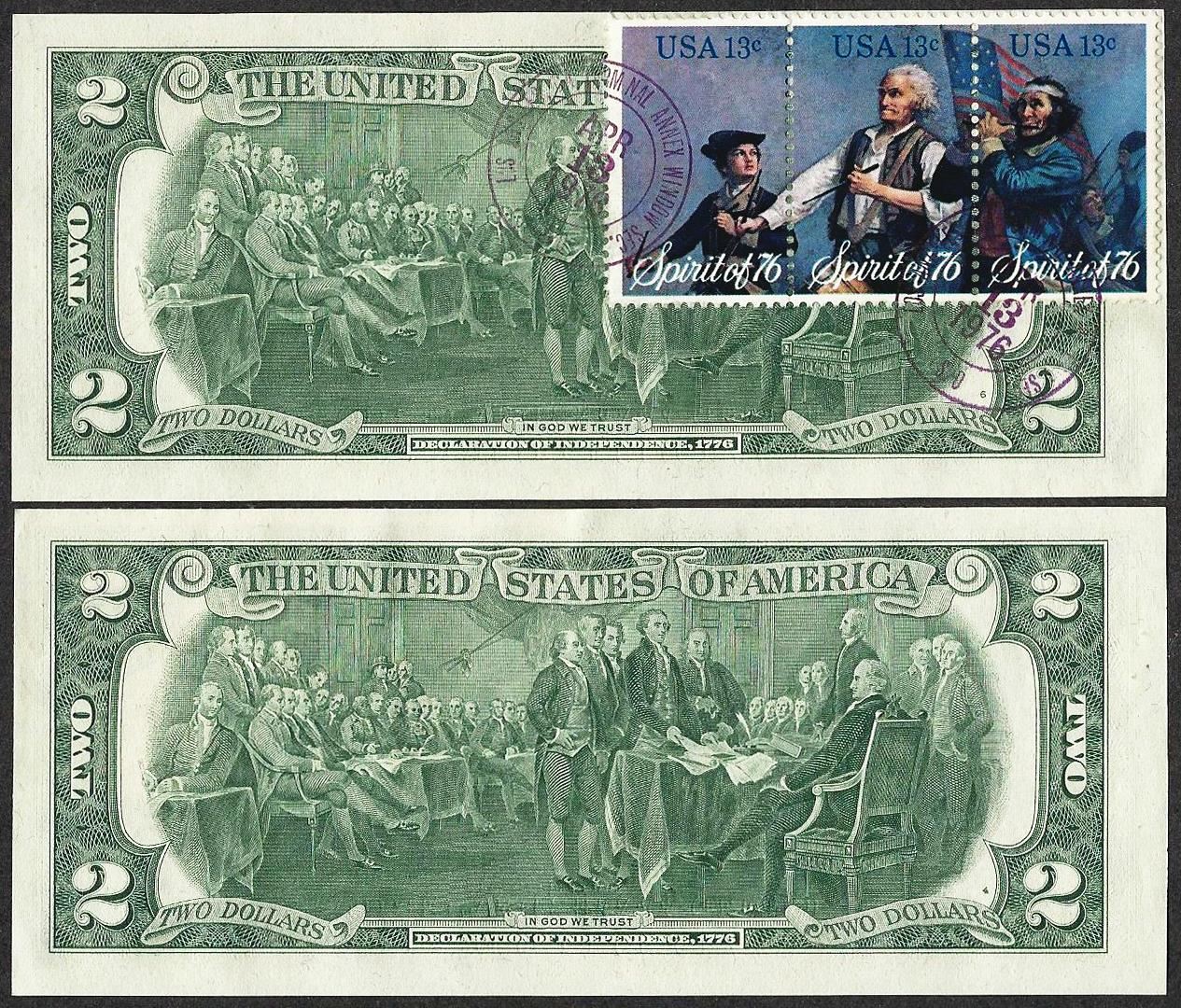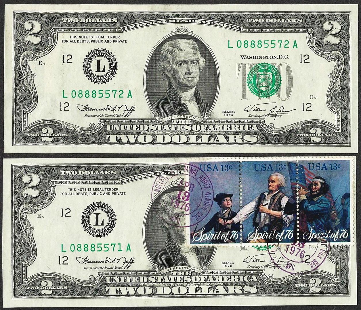 One Lot of (2) Consecutive 1976 $2 Federal Reserve Notes First Day Issue with Stamps.