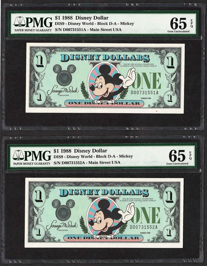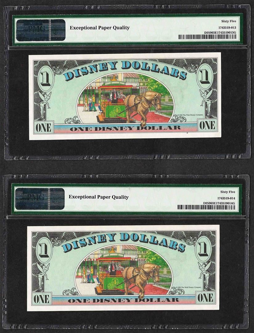 One Lot of (2) Consecutive 1988 $1 Disney Dollars Notes PMG Gem Uncirculated 65EPQ.