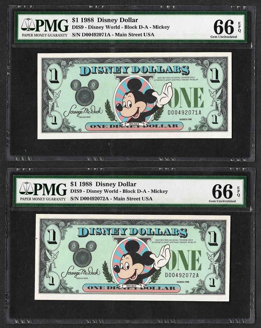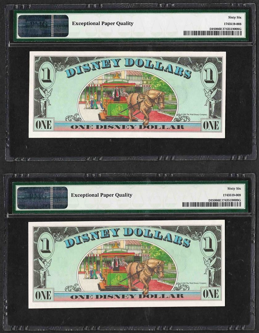One Lot of (2) Consecutive 1988 $1 Disney Dollars Notes PMG Gem Uncirculated 66EPQ.