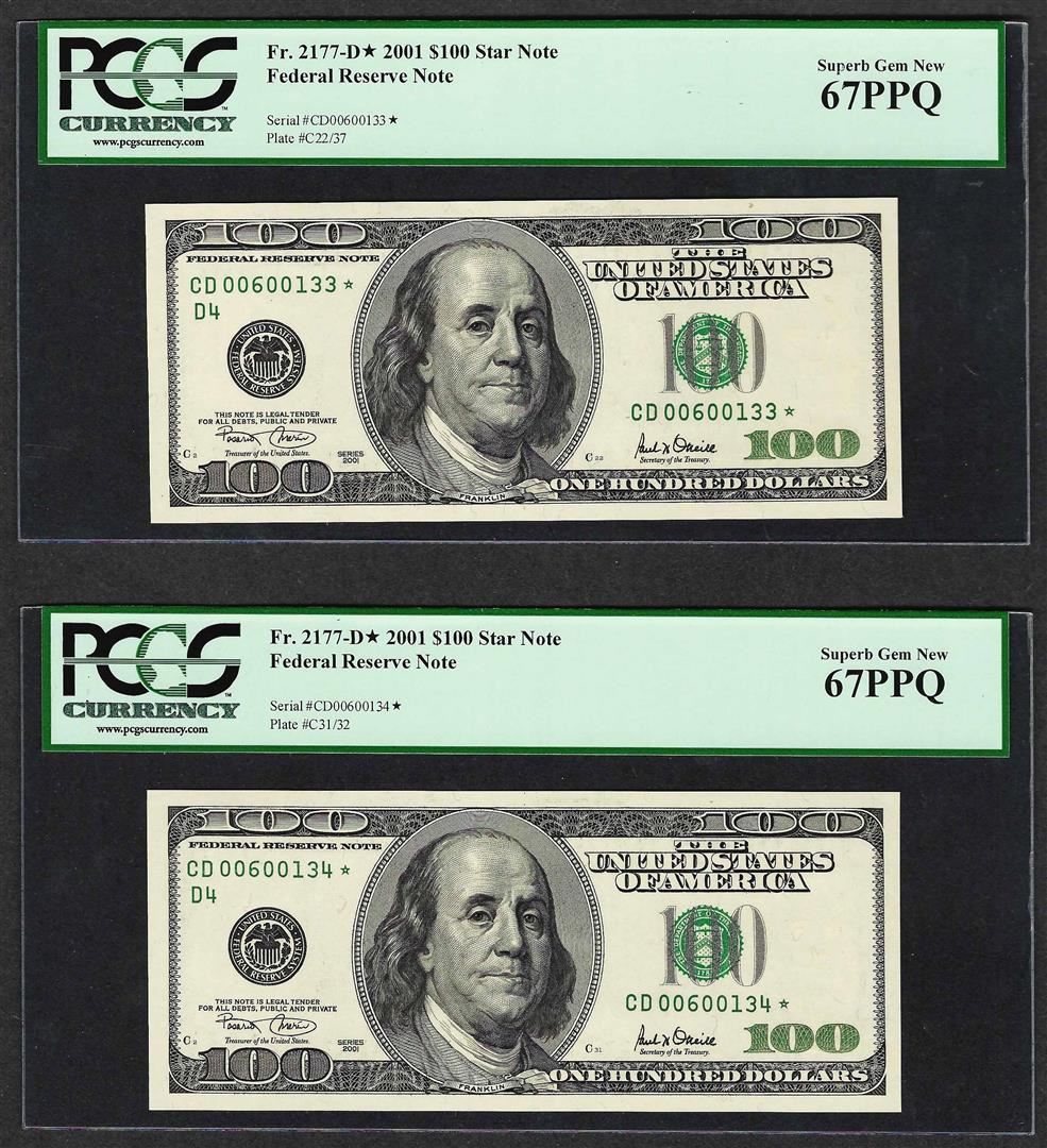 One Lot of Lot of (2) Consecutive 2001 $100 Federal Reserve STAR Note PCGS Superb Gem New 67PPQ. PCGS Graded.