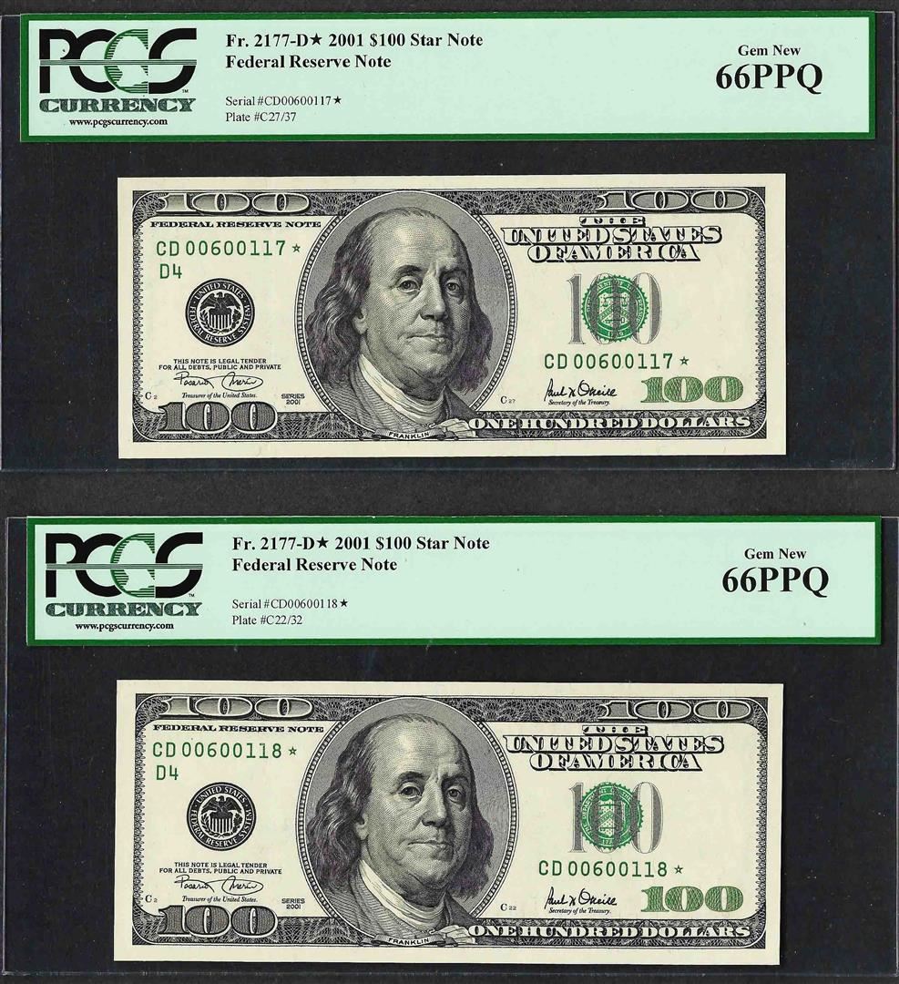 Lot of (2) Consecutive 2001 $100 Federal Reserve STAR Notes PCGS Gem New 66PPQ