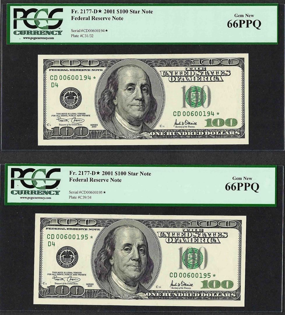 Lot of (2) Consecutive 2001 $100 Federal Reserve STAR Notes PCGS Gem New 66PPQ