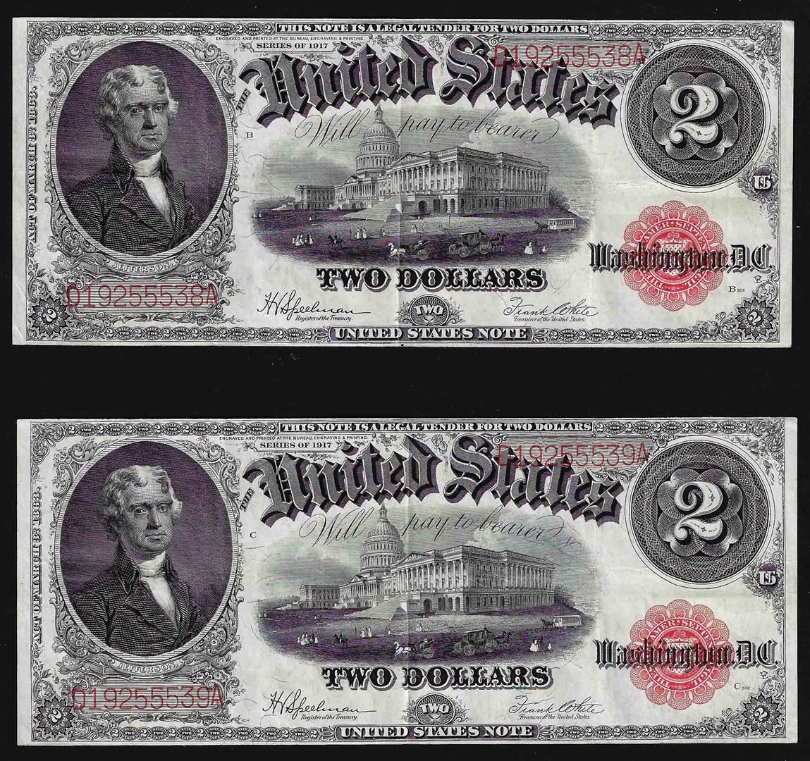 One Lot of (2) Consecutive Serial Number 1917 $2 Legal Tender Notes.