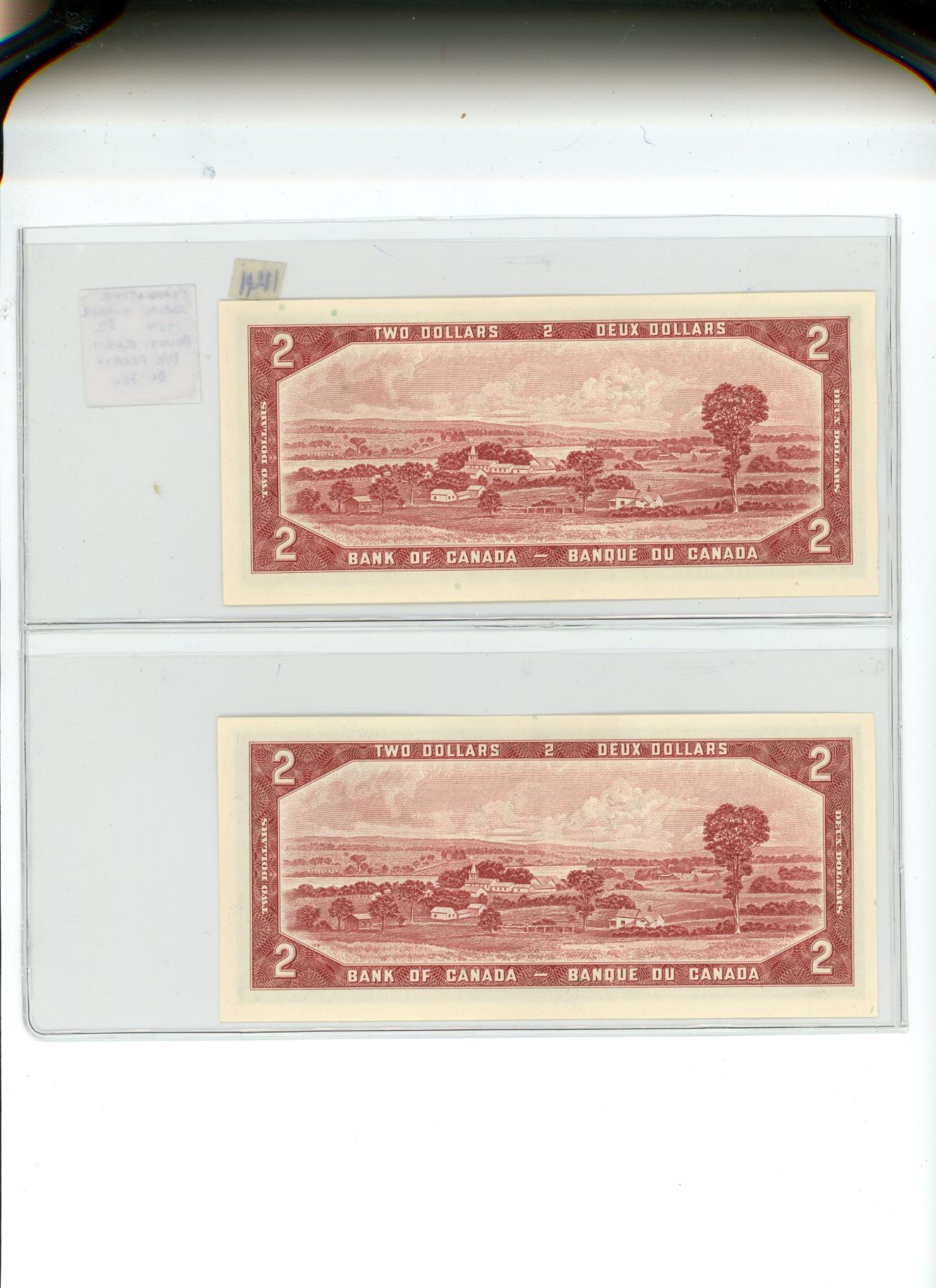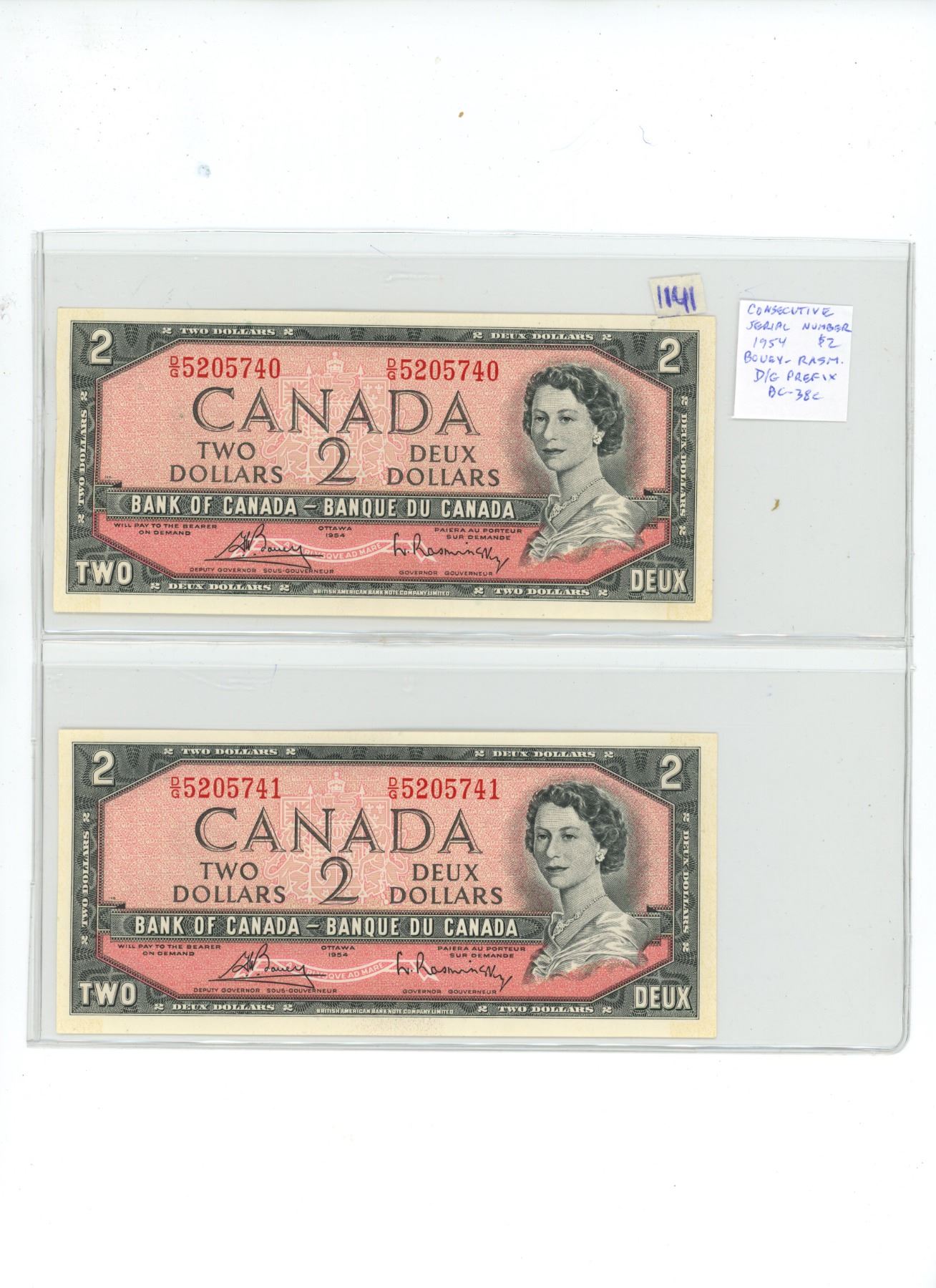Lot of 2 Consecutive Serial Number 1954 Modified Portrait $2 notes. Bouey-Rasminsky signatures. D/G Prefix. Serial Numbers 5205740 & 5205741. BC-38c.