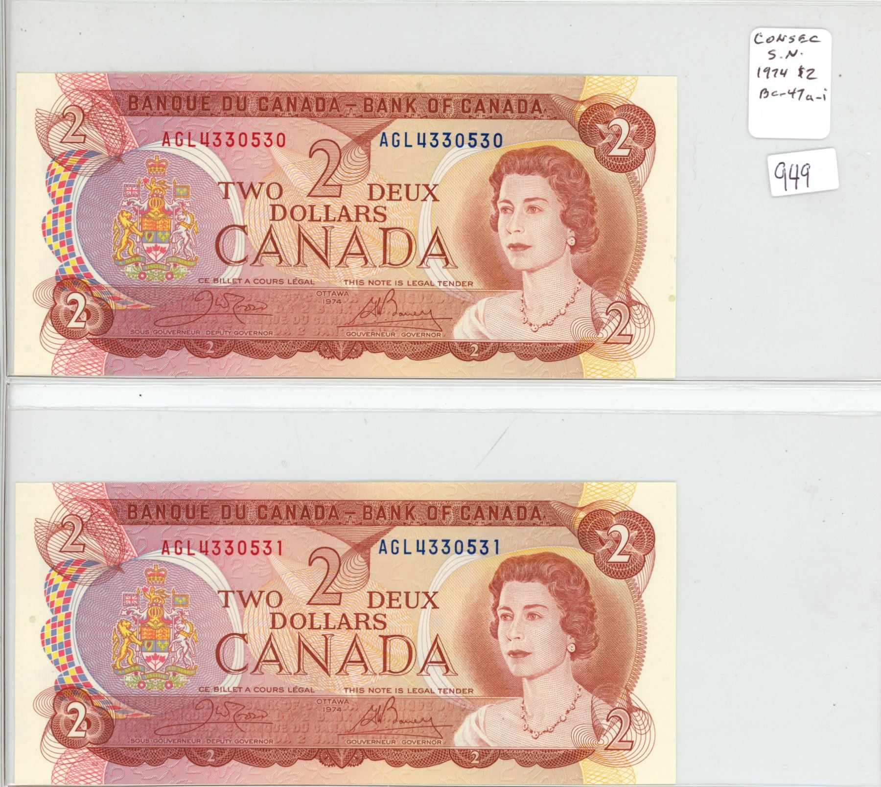 Lot of 2 Consecutive Serial Number 1974 $2. Crow-Bouey signatures. AGL Prefix. BC-47a-i. Serial Numbers 4330530 & 4330531.