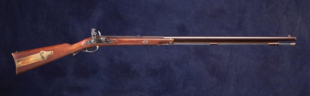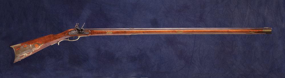 a) An Italian made 1803 Harpers Ferry rifle new in the box. Made in .54 caliber with eagle markings on the case colored lock, 34 1/2” half round barrel and brass hardware; b) Unmarked flint with 44” octagon barrel in what appears to be .36 caliber. Brass hardware and patch box. Quality manufacture with inlaid fish symbols. Shows some use but overall very good.