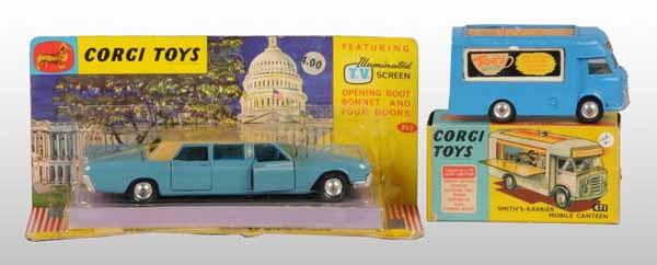 Description Circa 1965 to 1969. Includes number 262 Lincoln Continental in light blue, along with, number 471 Mobile Canteen. Plastic bubble has pulled away from the cardboard on the Lincoln packaging. Condition (Very Good). Size Largest: 8" L.