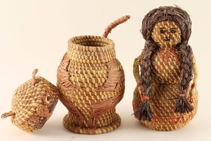 Cat basket measures 7 1/2"x4" and woman with braids basket measures 8"x4" Made in Southern Louisiana forests by the Coushatta tribe of pine needles and raffia.