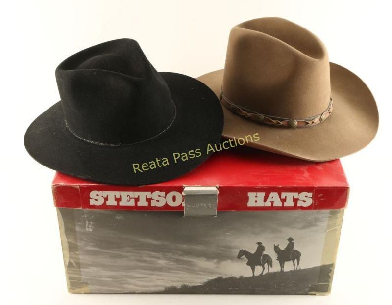 Resistol long oval 7 1/2" brown felt hat with leather hatband and a black stetson-Gun Club Edition 4X size 7 1/2.