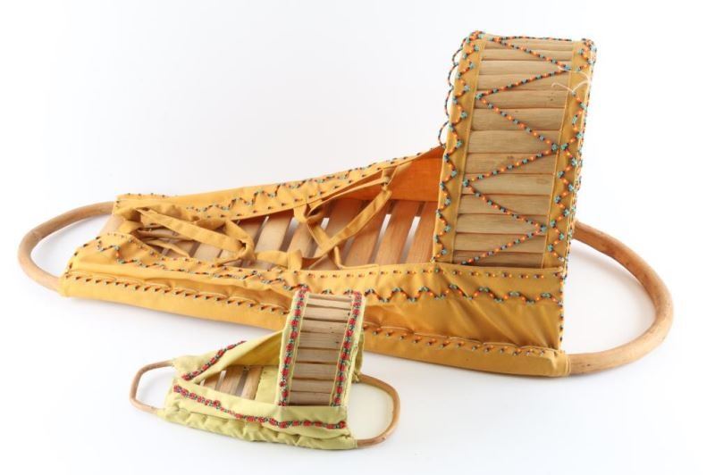 Large one is wood with brown fabric with beaded accents measures 28"x11" . Smaller one is 10"x5"