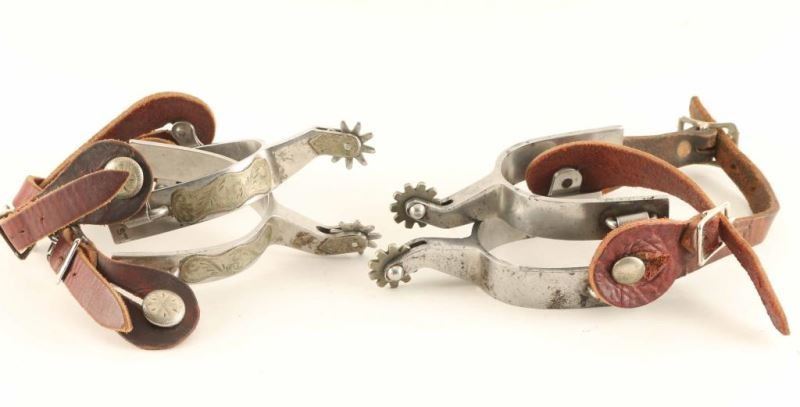 (1) Nickeled Spurs with raised engraved design with leather spur straps, maker marked Crockett and "ST" (1) Plain Crockett spur maker marked with leather spur straps.