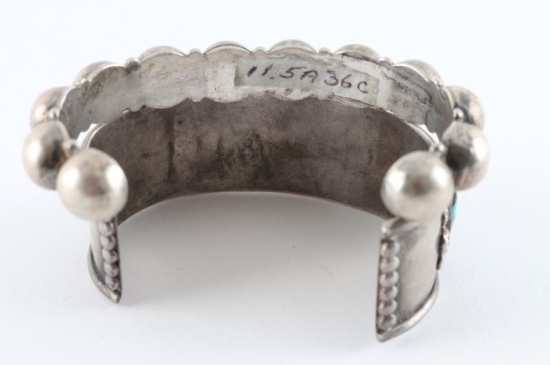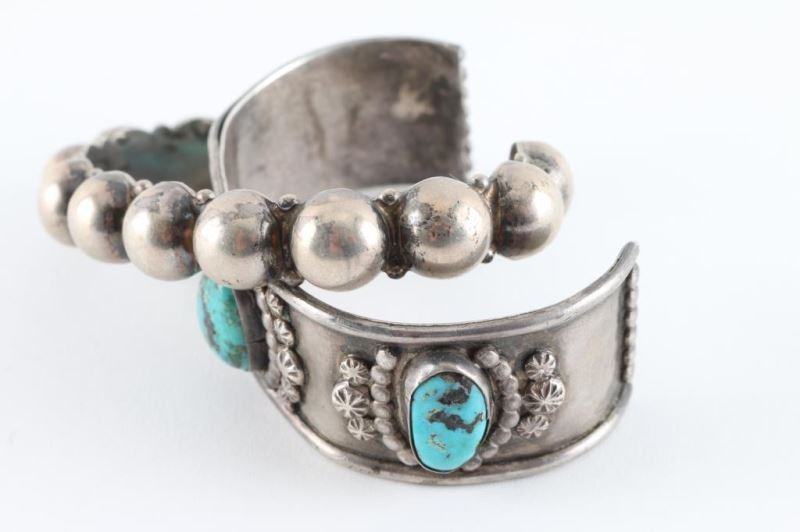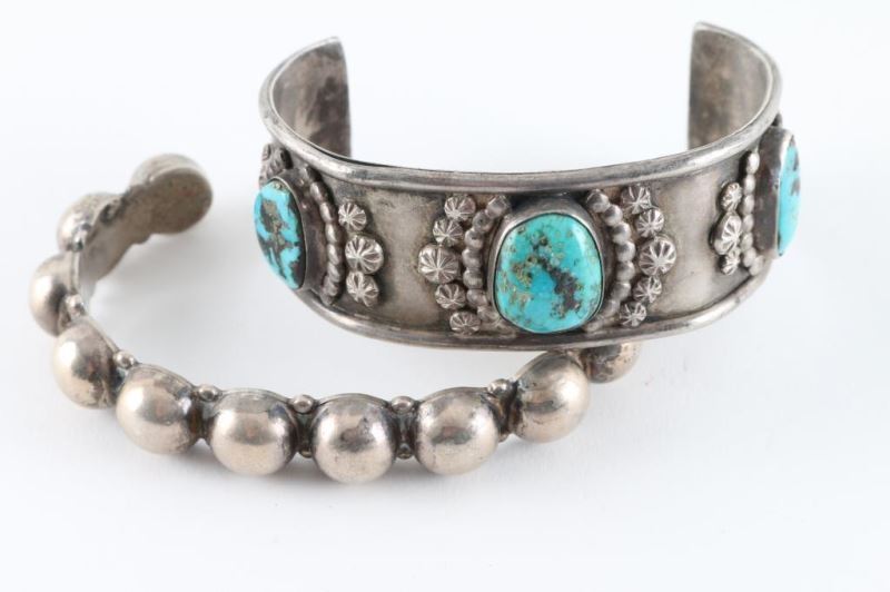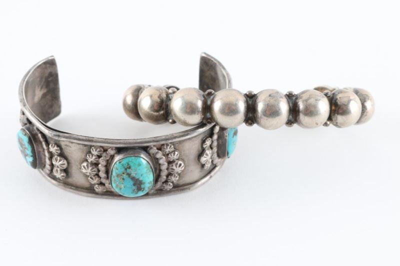 (1) Native American 3 stone turquoise cuff set in sterling (1) Traditional Mexican Bubble Sterling Cuff Both unsigned.
