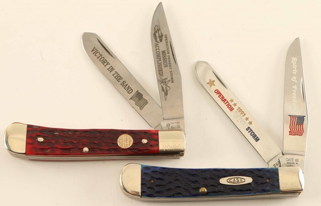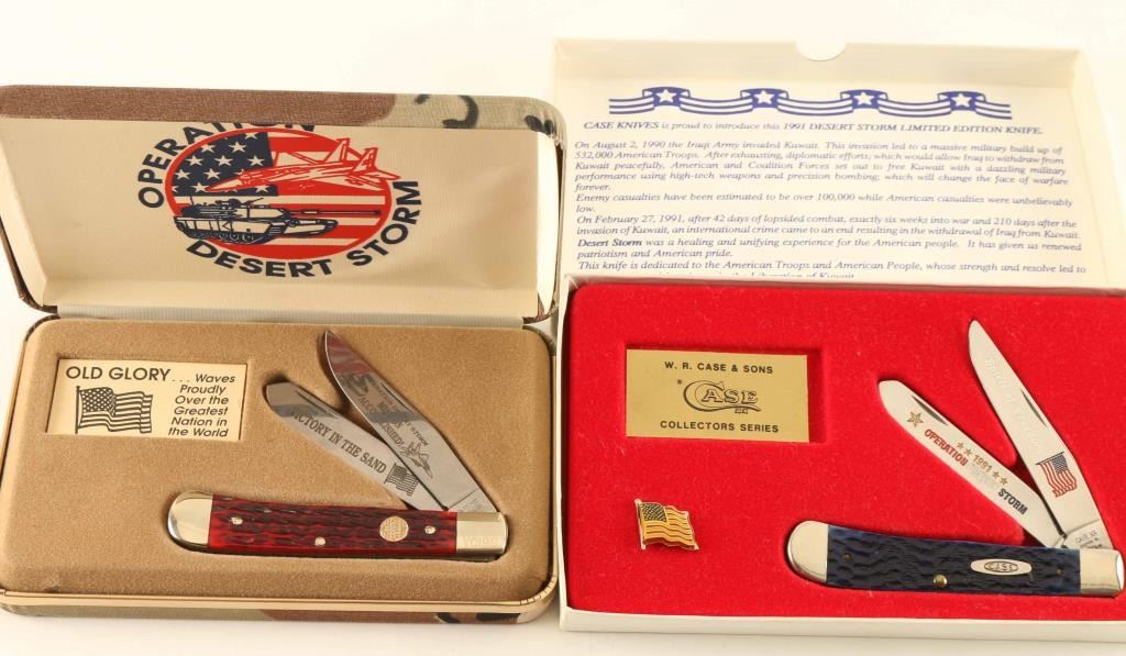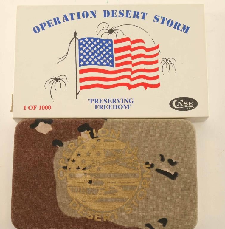Case XX 'Operation Desert Storm' Limited Edition 580/1000 with blue bone handle in original presentation box. Boker brown bone handled knife in desert camo presentation box.