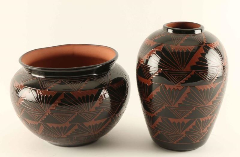 Both with fan, step and triangle designs in black. Both signed 'Priscilla Benally & Melvin Chavez' on base. Measure 7"x8 1/4" and 9 3/4"x6".
