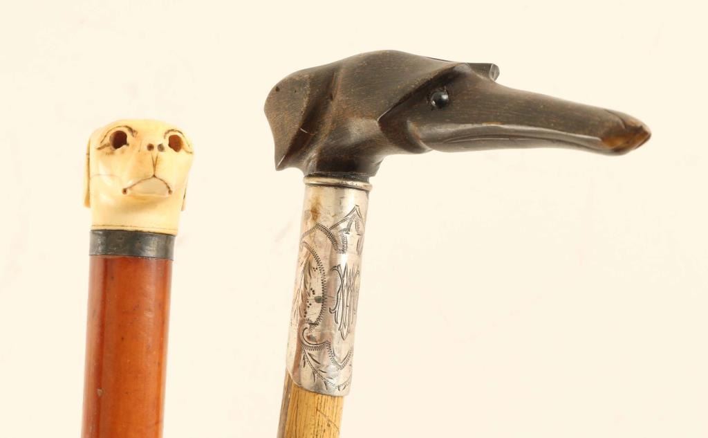 Lot includes two beautiful dog head canes. One of the canes has an beautiful ivory dog head. The other cane has a dog head made of wood resting on sterling silver with an elegant design.