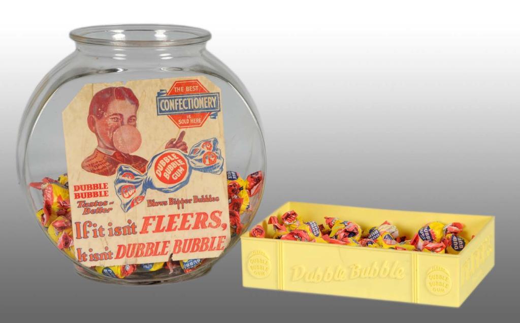 Description Circa 1930s. Includes one Fleer's Gum jar with no lid depicting a paper label showing a boy blowing gum. Also includes plastic Double Bubble tray with one crack on back and Double Bubble gum included, some contemporary and some early. Displays nicely. Condition (Good - Excellent). Size Largest: 8" x 8 - 1/2".