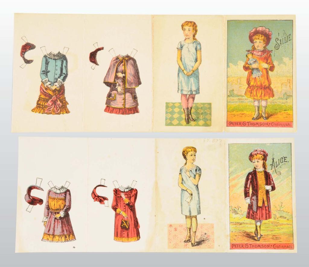 Description Circa 1880s. Published by Peter G. Thompson, "Alice" and "Sallie" are uncut. Each doll has three outfits and three hats in a five panel folder. Some wear, staining and age.