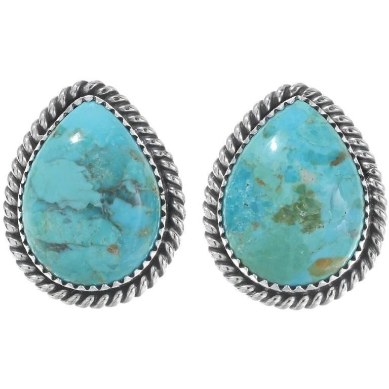 (1) Pair of Navajo Turquoise teardrop shaped earrings set in sterling. (1) Sterling Cross Pendant on chain and Earrings set.