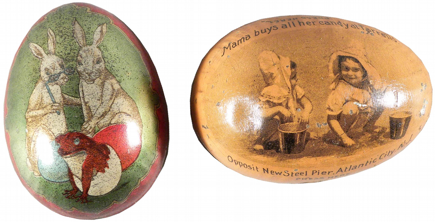 Lot of 2 Egg Shape Advertising Candy Containers. Including Modern Confections w/bunny motif and Farrells Confections Atlantic City w/children playing in the sand. Each measures 2 1/2 inches long.