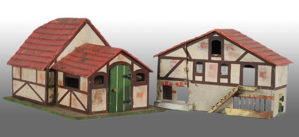 German. Circa 1920s. Both with hand-painted red and black roofs, wood sides, and wood bases. Both have interiors. Very unusual toys. Condition (Excellent). Size Largest: 15" x 10" x 10".