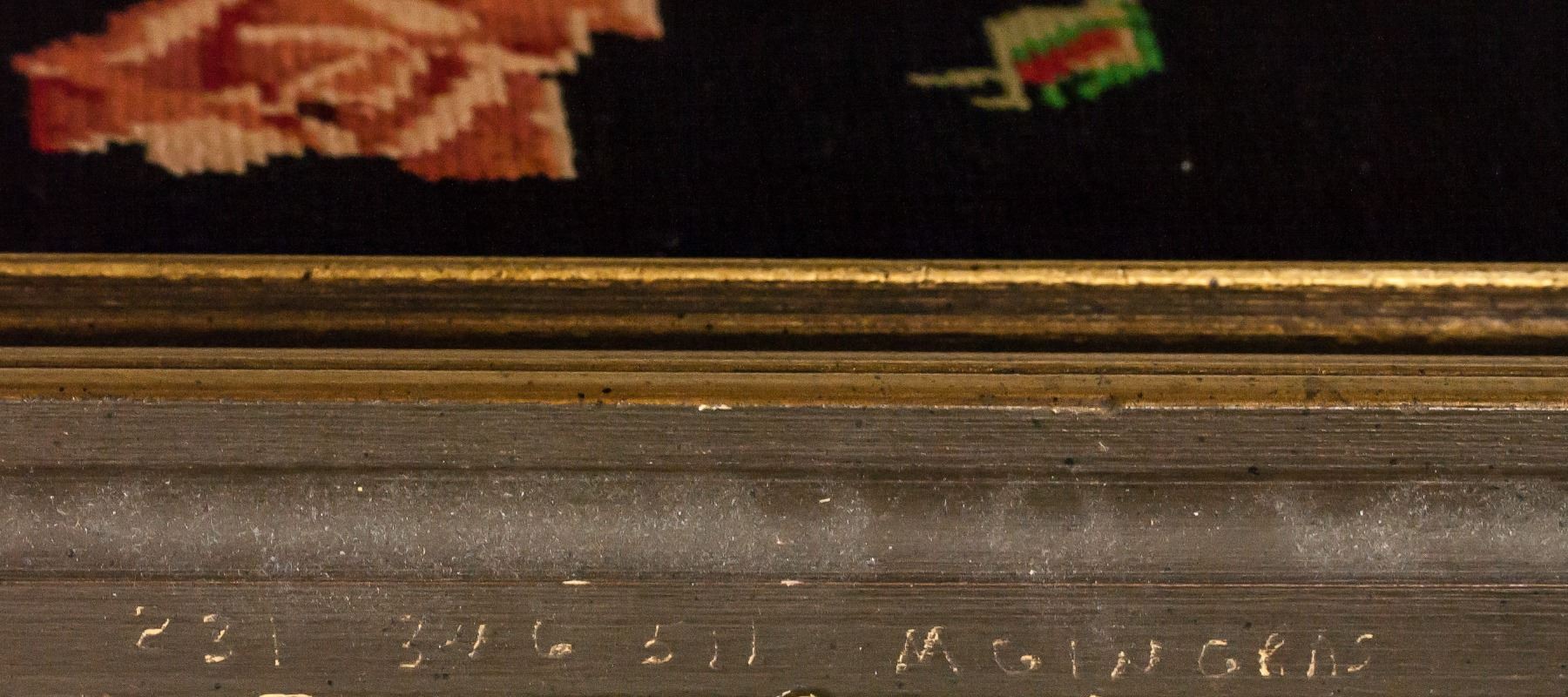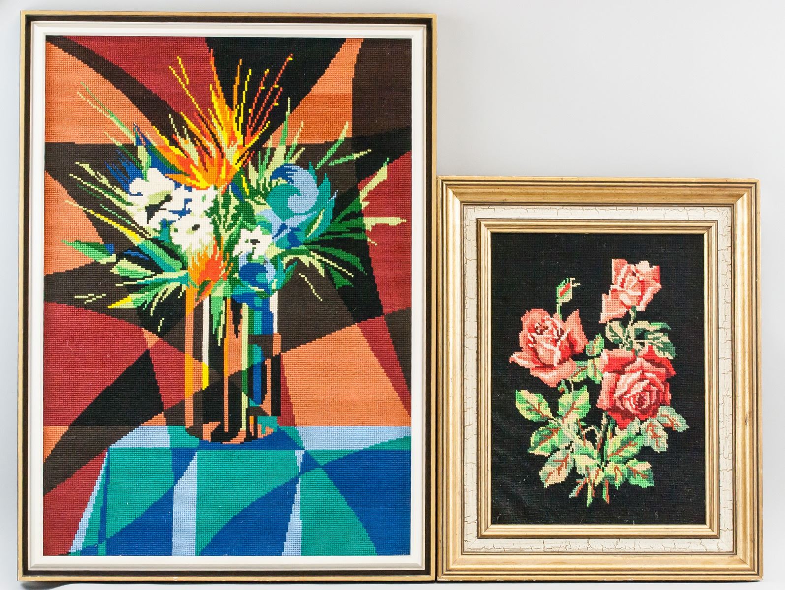 Lot of two embroidery panels, framed. Larger piece features an vase of flowers in a geometric style. The smaller piece features embroidery of three roses. "Z 31 346 511 M GINGRAS" inscribed on frames. 67 x 46 cm (26 x 18 in), Frame: 74 x 53 cm (29 x 21 in) Size of larger piece only.