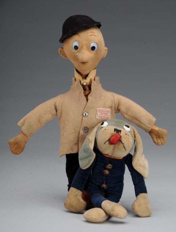 Includes a rare Tom Webster's George with tag sewn on left part of jacket that reads "Hygienic Toys Made in England by Chad Valley Co. Ltd.". Also includes rabbit smoking a pipe. Both are felt-covered. Condition (Very Good). Size Largest: 12" T.