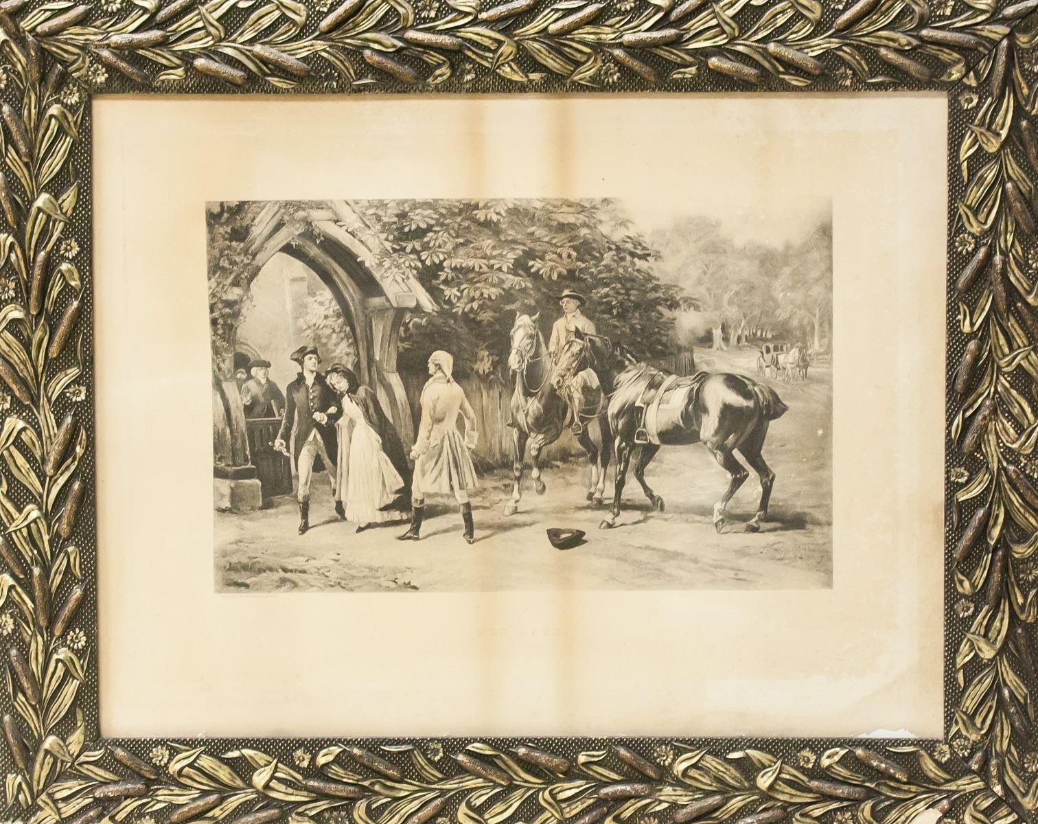 Lot of two (2) lithographs on paper, framed. Featuring hunting parties. "PAINTED BY HEYWOOD HARDY" printed in the bottom left corner, with "TOO LATE" printed beneath the image. "PAINTED BY S. E. WALLER" printed in the bottom left corner with "'TWIXT LOVE AND DUTY" printed beneath the image. Print: 26 x 42 cm (10.25 x 16.5 in) and 30 x 48 cm (12 x 19 in), Frame: 66 x 81 cm (26 x 32 in).