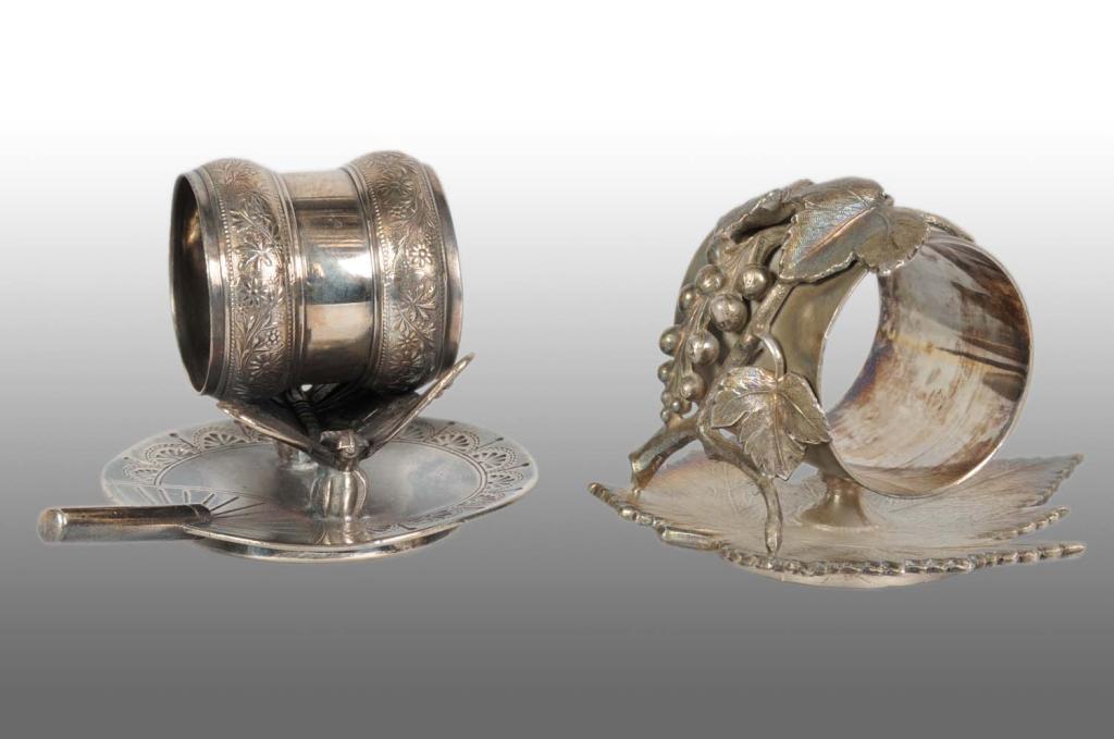 Includes a napkin holder on two butterflies on oriental fan base marked "Meriden Britannia Co." and numbered "209". Next is a napkin holder with berries and leaves climbing up side of holder on a maple leaf base marked "Standard Silver Co. Toronto" and numbered "791". This piece has some silver loss but no breaks. Condition (Excellent).