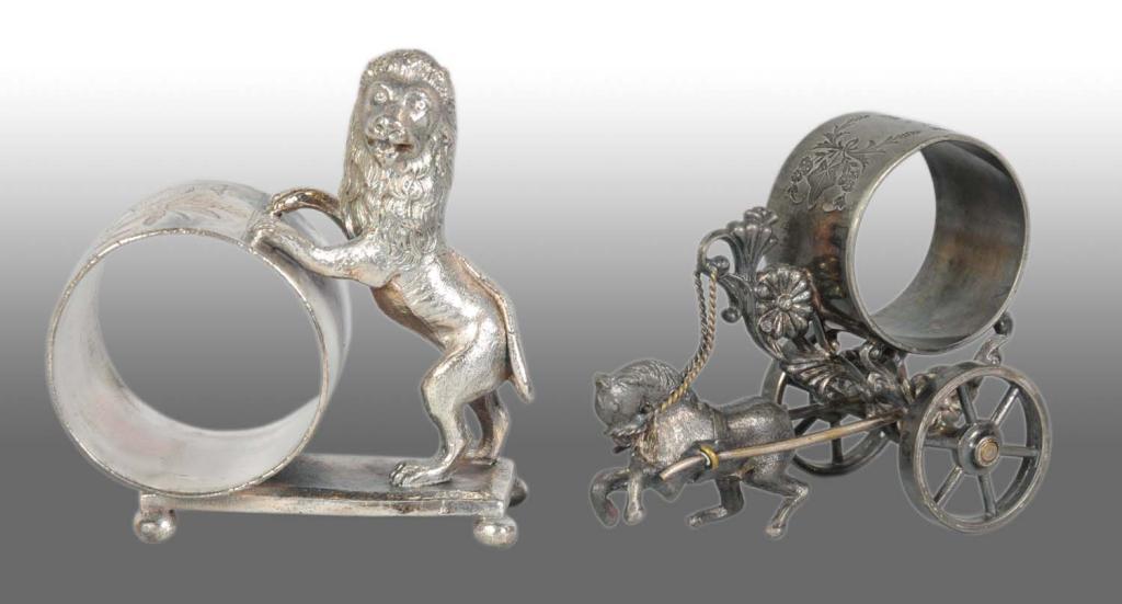 Includes a large lion rampant with front paws on napkin holder on small rectangular footed base marked "Rogers & Bro" and numbered "153". Next is a small rearing horse pulling child-sized napkin holder on wheels marked by one of the Rogers' Companies but not clear enough to distinguish. This piece is numbered "213" and the horse's tail is broken off and missing with silver loss. Condition (Very Good).