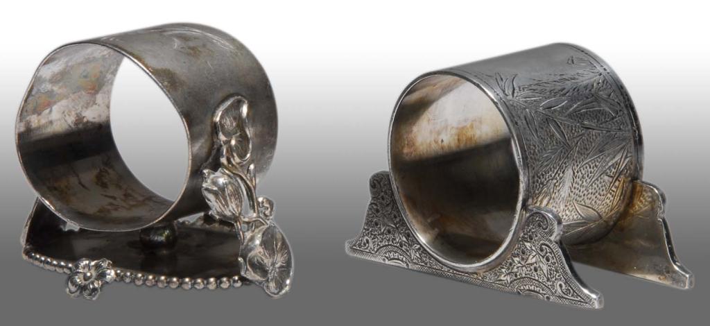 Includes a napkin holder on ball pedestal with leaves and flower buds climbing up each side all resting on an oval base with two small flowers and bead edge. This piece has no manufacturer's name or number. Next is napkin holder supported by two horizontal pieces of fretwork giving it a sleigh-effect. This piece has no manufacturer's name or number. Condition (Good - Very Good).