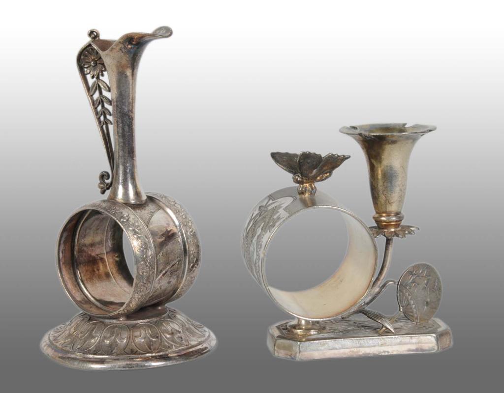 Includes a pitcher-shaped bud vase on top napkin holder on raised domed round base marked "Reed & Barton" and numbered "1337". Next is a butterfly perched on top napkin holder with a silver-plated bud vase and oriental fan on raised rectangular base marked "Simpson, Hall, Miller & Co." and numbered "024". Condition (Very Good).