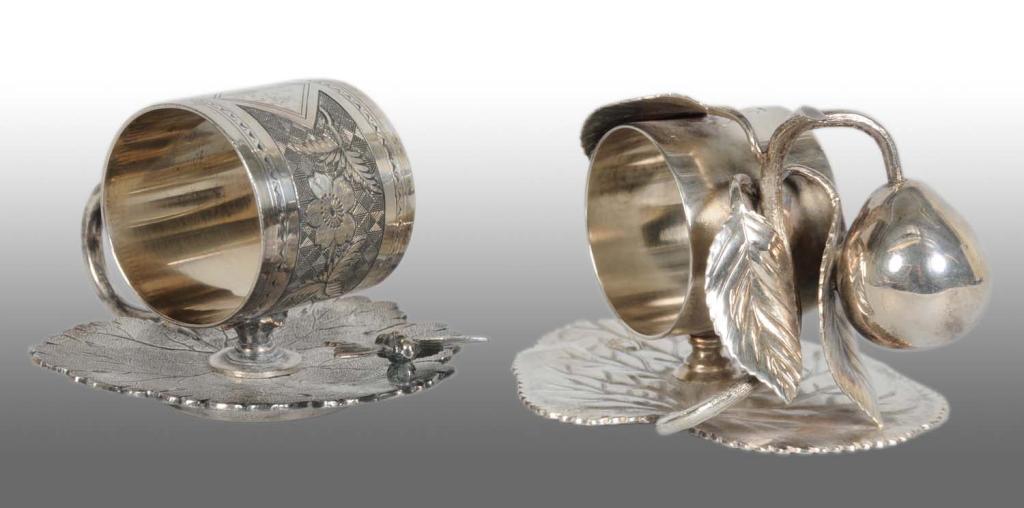 Includes a napkin holder on leaf base with a finger hold butterfly perched on base marked "James W. Tufts" and numbered "1542" with some silver loss. Next is a napkin holder on leaf base with large pear and leaves marked "Hartford Silver Co." and numbered "2902". Condition (Good - Excellent).