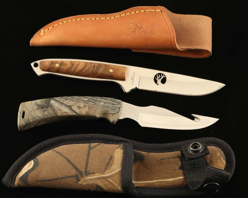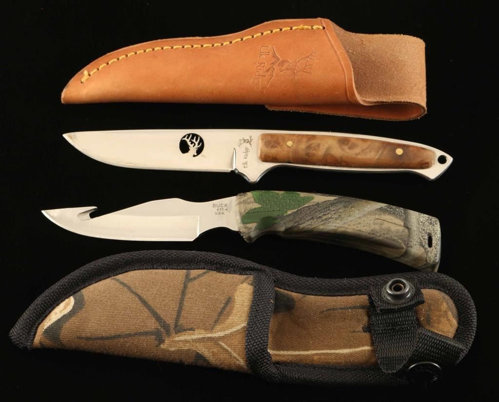 Buck 477 Caping Knife, small field dressing knife designed for detailed caping work 7 1/8" overall in nylon camo sheath like new condition. Elk Ridge knife with leather sheath, 440 SS 3" blade, approx. 7" overall with wood handle and cut-out of elk in blade. Like new condition.