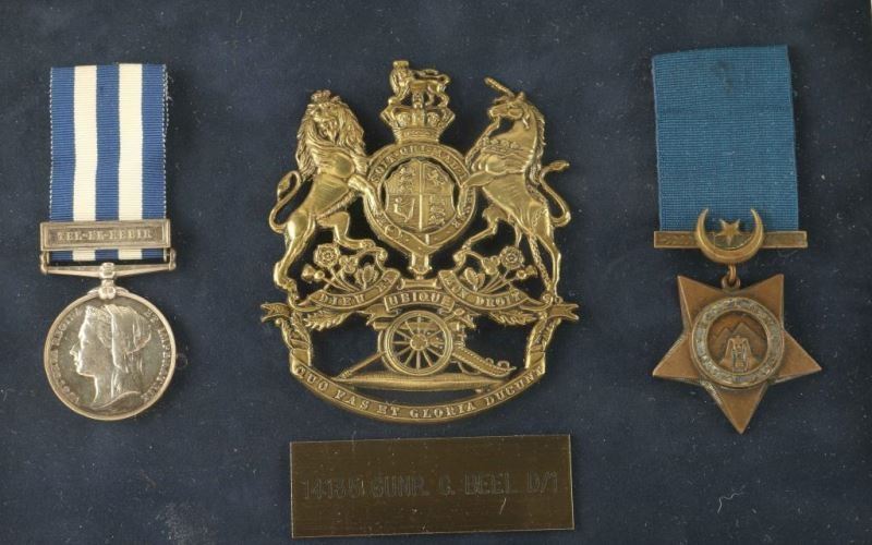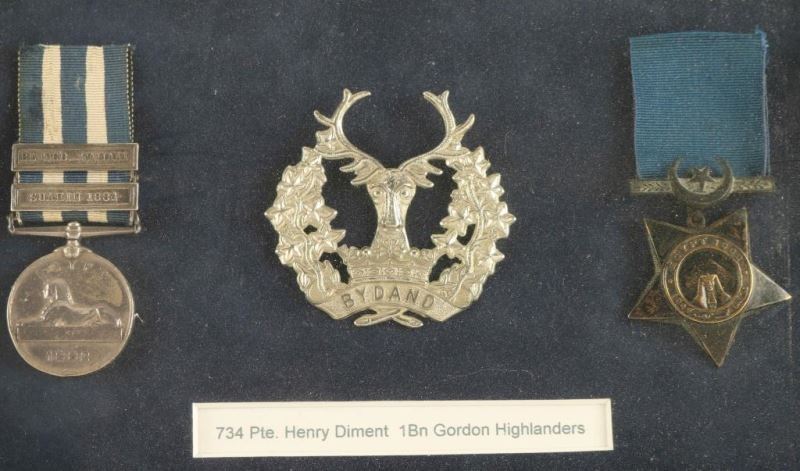 (1) '734 Pte. Henry Diment 1Bn Gordon Highlanders' Sudan war medals and star 1882 with dark blue mat background and single blue mat in silver frame measures 10 1/2"x14 3/4". Includes envelope with information on back. (1) '14135 GUNR. C. BEEL D/1' on brass title plate with star and medals on dark blue mat background with blue mat in gunmetal gray frame. Measures 10 7/8" x 14 3/8". From The John F Sukey Collection