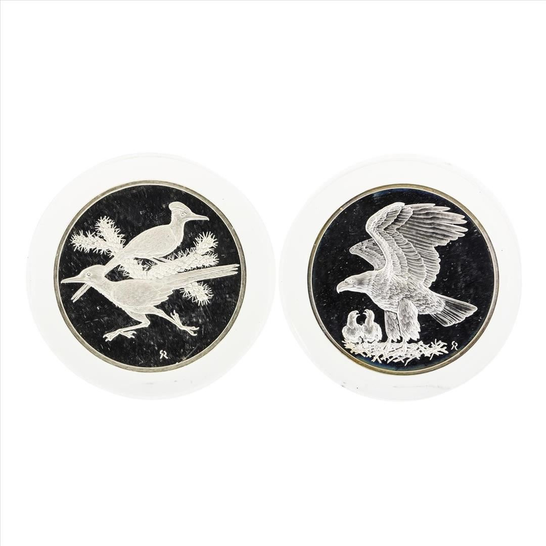 One Lot of (2) Franklin Mint Roadrunner and Bald Eagles Art Medals. The total weight of each medal is 1000 grains which is approximately 2 troy ounces of sterling silver.