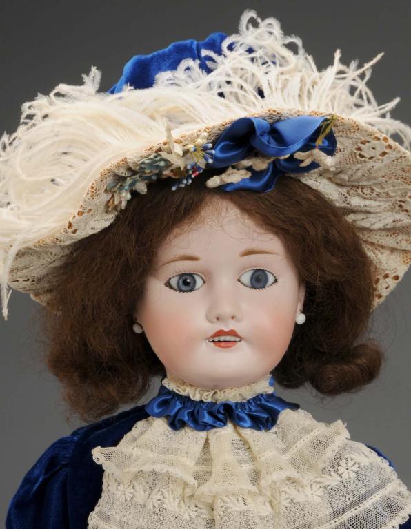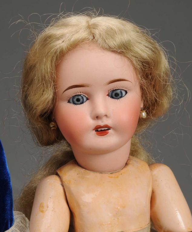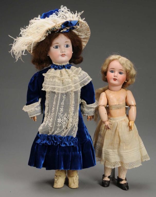 French, circa 1900. One with bisque socket head incised Limoges France. Blue sleeping eyes, open mouth with teeth, pierced ears, replaced mohair-type wig, and original jointed French composition body. Wearing original underwear, shoes and socks. One hand is flaking, and one is replaced. Also tiny wig pull. The other doll with bisque socket head incised Limoges France. Blue paperweight eyes, open mouth with teeth, pierced ears, original human hair wig, and original jointed French composition body. Wearing fancy new blue velvet dress and matching hat. Wear and flaking, scratch on eye, and tiny under paint eye flake. Condition (Good). Size Largest: 23" T.