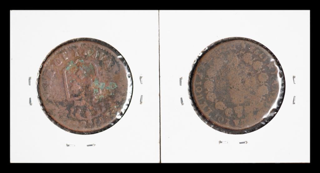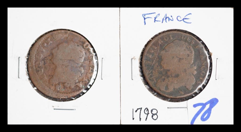 Lot of 2 French coins, one dated 1765, the other dated 1798; interesting pieces that could have been in the "Colonies" at the beginning of our Country. Est.: $30-$60.