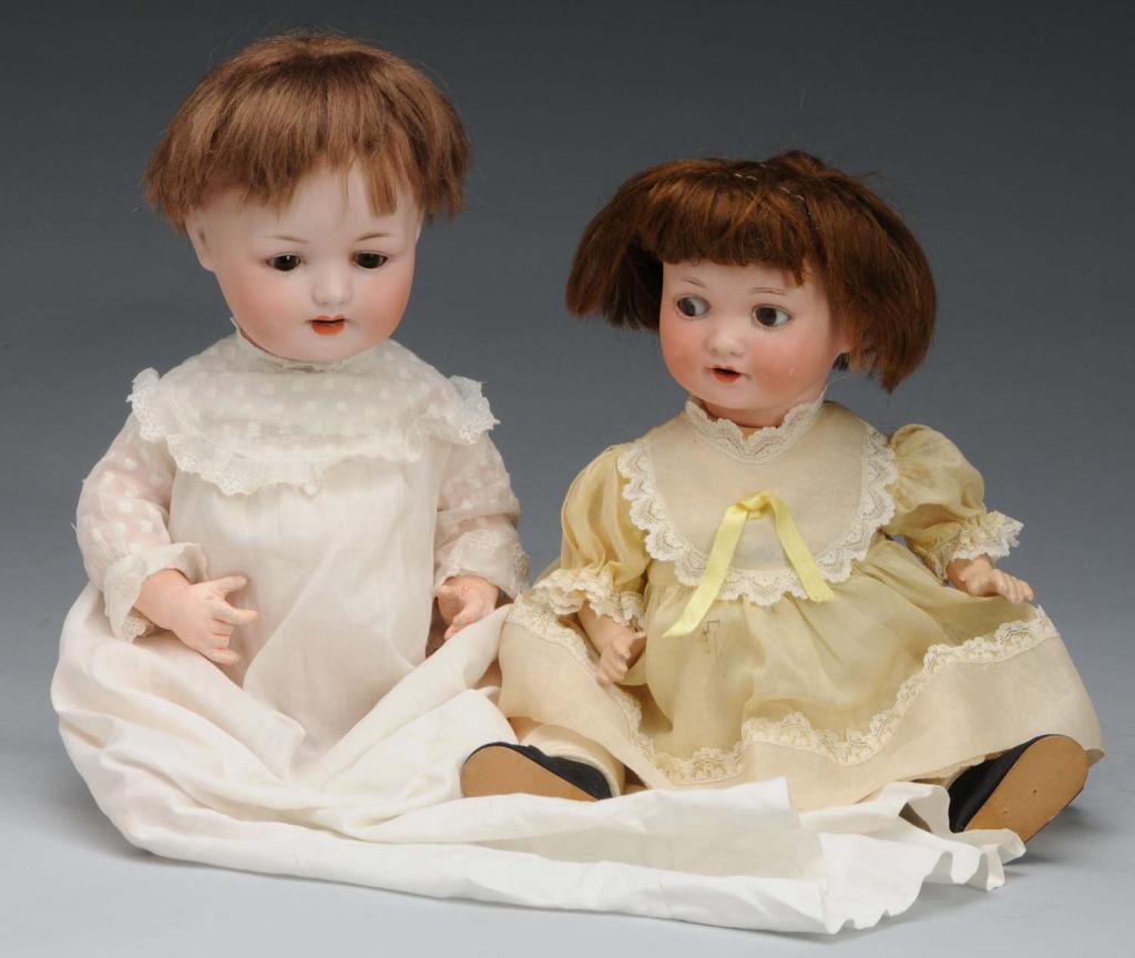 Description Largest doll incised "P.M. Grete". The smaller doll is an Armand Marseille 985. Both dolls have blue glass eyes, open mouths, and upper teeth. Bodies on both dolls show some wear with two fingers missing to that largest doll. Condition (Good). Size Largest: 13 - 1/2" T.
