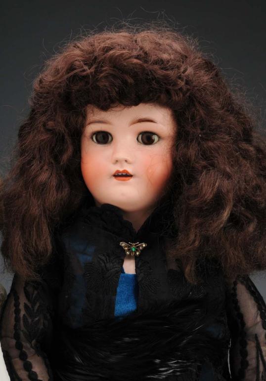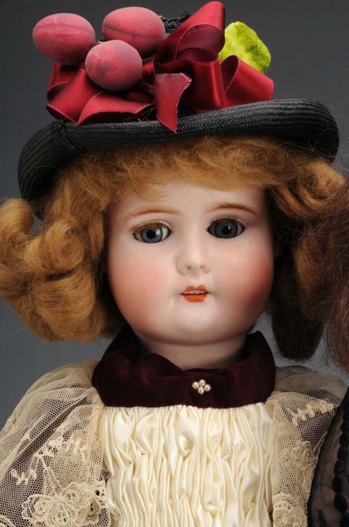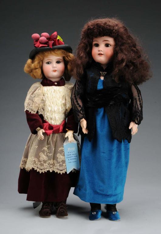 Description Largest is a Simon & Halbig Heinrich Handwerck doll with brown glass sleep eyes, open mouth with teeth, and original body with some repaint and appropriately redressed. One slight red firing line on back of head, most likely a color run. Also includes a second doll incised "A.W.Special" with a repainted body and replaced outfit. Condition (Good). Size Largest: 27" T.