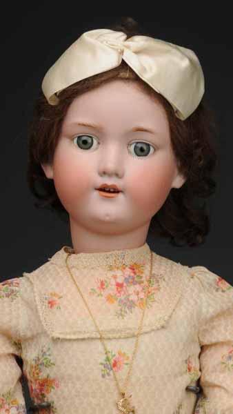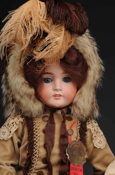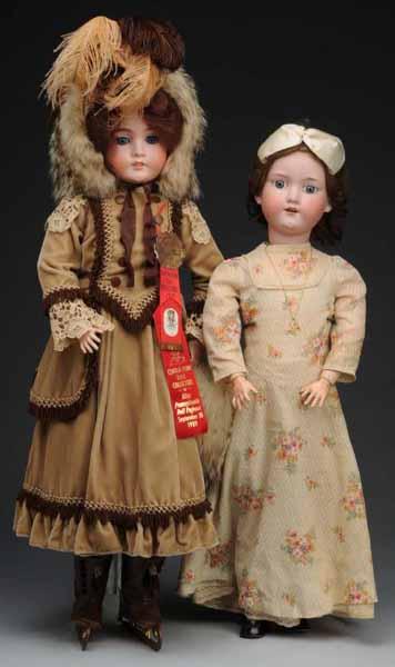 Description Germany, Ca. 1900. Bisque socket head incised "A.M. 390", by Armand Marseille, set blue eyes, multi-stroked eyebrows, open mouth with teeth, chin dimple, original mohair wig (glued tightly on), jointed composition body (wear at joints), dressed. Bisque socket head incised Viola, sleeping eyes, open mouth, original mohair wig, jointed composition body (replaced but antique hands), velvet skating outfit with fun hat and muff. Condition (Very Good). Size Largest: 32" T.
