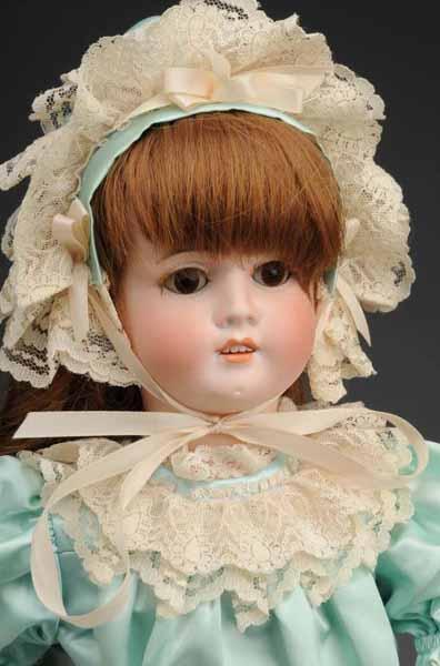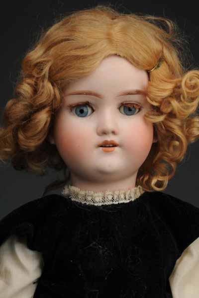 Description Ca. 1900. Bisque socket head incised "Made in Germany 68", set glass eyes, replaced human hair wig, jointed composition body (wear and soil, finger off), dressed. Bisque socket head incised "Armand Marseille 390", vintage mohair wig glued down tight, jointed composition body (hands repainted), dressed. Condition (Good). Size Largest: 24" T.