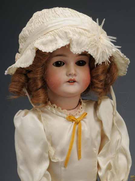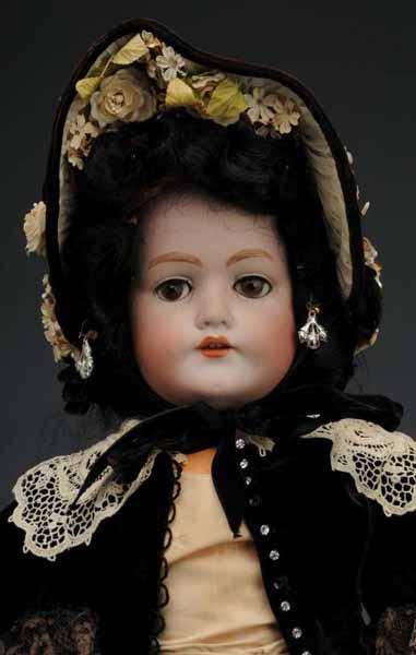 Description Ca. 1900. Bisque socket head incised "Queen Louise", sleeping eyes, open mouth, replaced wig, jointed composition body (repainted), dressed. Bisque socket head incised "C.M. Bergmann", sleeping eyes, open mouth, replaced wig, jointed composition body (repainted), fancy taffeta and velvet gown and hat. Condition (Good). Size Largest: 27" T.