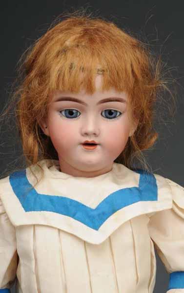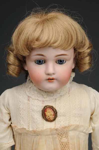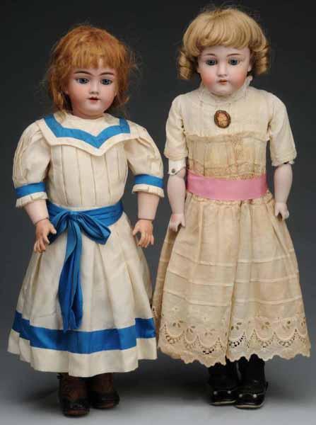Description Ca. 1900. Bisque socket head incised "Heinrich Handwerck 119-13", sleeping eyes (eye chip, some wax missing), open mouth, pierced ears, vintage human hair wig, jointed composition body (repainted hands). Bisque shoulder head incised "dep 154 13" by J. D.Kestner, sleeping eyes, open mouth, replaced wig, jointed kid body with bisque lower arms (lots of tape on the legs), vintage dress with cameo pin. Condition (Fair). Size Largest: 27" T.