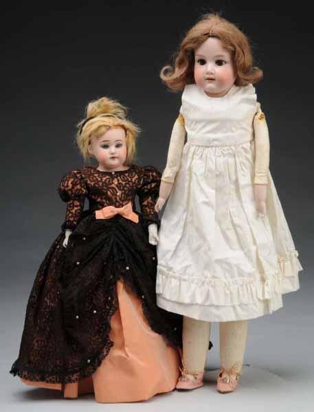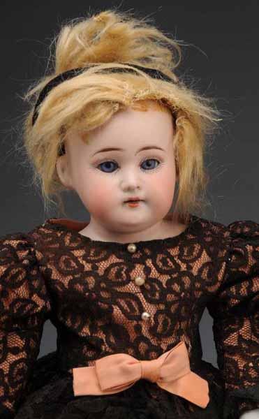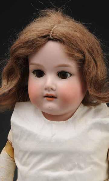 Description Germany, Ca. 1900. Bisque shoulder head incised "370 AM 1 Dep", made by Armand Marseille, sleeping eyes, original mohair wig (glued down tight), original jointed kid body with bisque lower arms (some patches). New slip, original pink cloth shoes. Excellent condition. Bisque shoulder head (hard to read numbers, but probably by A.M.), set blue glass eyes, open mouth with teeth, original mohair wig (scrappy), kid body with bisque hands (lots of patches), redressed. Condition (Fair). Size Largest: 21" T.