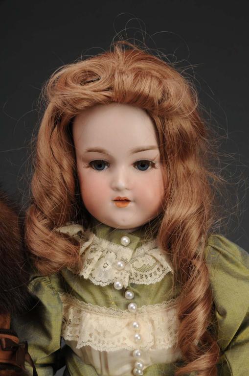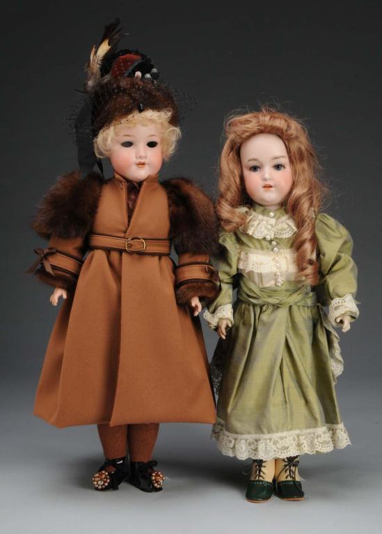 Description Includes one Armand Marseille 390 doll on a composition body and with an old blonde mohair wig and eyes dislodged inside head. Also includes one GB Germany doll with fixed glass eyes, painted upper and lower lashes, and additional false eyelashes applied on a newly painted wood and composition body. Condition (Good). Size Both: 23" T.
