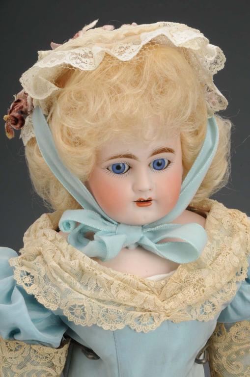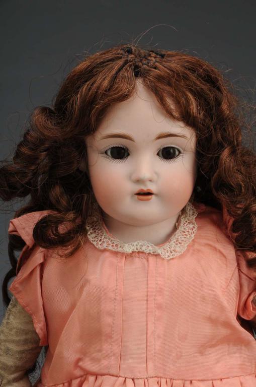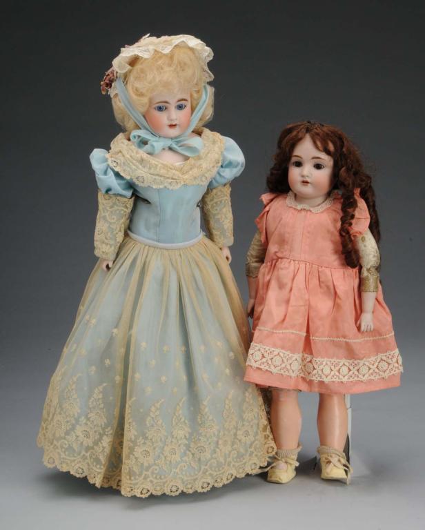 Description Largest is a shoulder head doll with open mouth, fixed blue glass eyes, and incised "309" on back of shoulder with leather body, bisque forearms, and composition lower legs. Also includes a Kestner 154 shoulder head doll with open mouth, brown glass sleep eyes, and leather body with bisque forearms, and composition lower legs. Condition (Good). Size Largest: 19" T.