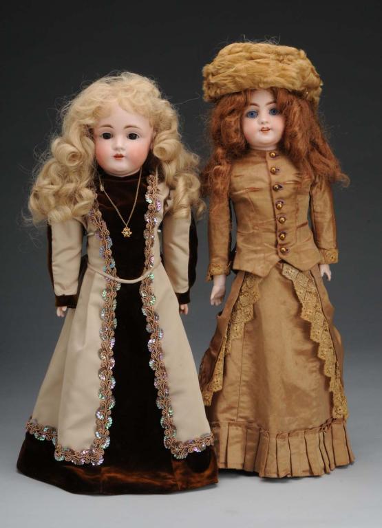 Description Largest doll is a Simon & Halbig doll with blue glass sleep eyes, leather body, bisque forearms, and elegantly dressed in a silk fashion doll costume. Also includes a Kestner 154 shoulder head doll with brown glass sleep eyes, open mouth with four upper teeth, painted upper and lower lashes, and wearing a replaced costume. Condition (Good). Size Largest: 25" T.