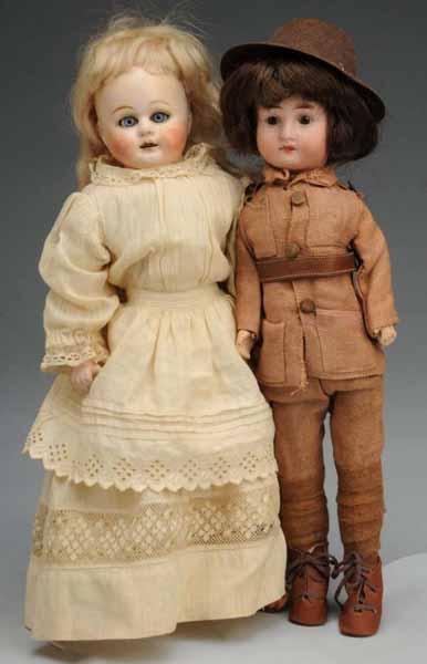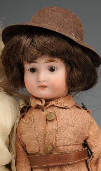 Description German patent washable girl with composition shoulder head (crack on plate), inset glass eyes, vintage mohair wig, open mouth with upper teeth, original cloth body with composition arms and legs, Very nicely dressed in vintage clothes, underwear, shoes and stockings. German bisque socket head incised "4/0", stationary glass eyes, open mouth, replaced wig, five-piece papier-mache body. Original uniform, maybe a Teddy Roosevelt Rough Rider or a World War I soldier. Condition (Very Good). Size Both: 14" T.