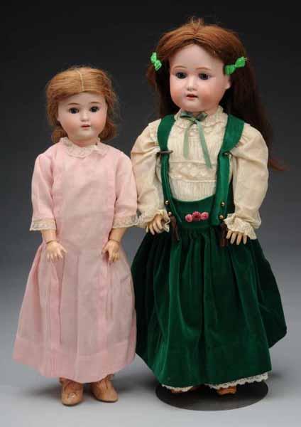 Description Germany, Ca. 1918. 23-inch doll marked "Special", made by Kley & Hahn. Sleep eyes with real upper eyelashes, open mouth, original wig, excellent jointed composition body, original pink cotton dress, shoes and socks. 25-inch doll marked "MB Japan", made by Moramura Brothers. Sleeping eyes, open mouth, vintage human hair wig, jointed composition body with repainted hands, vintage chemise, new green velvet skirt, shoes and socks. Condition (Excellent). Size Largest: 25" T.